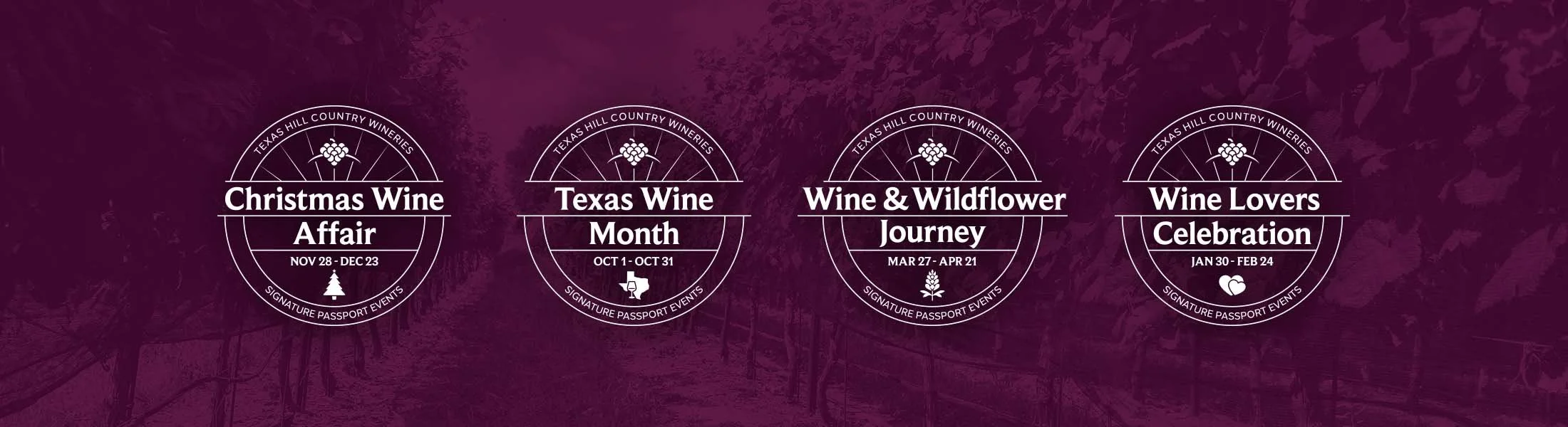 Texas Hill Country Wineries is a non-profit organization dedicated to promoting member wineries and the exceptional Texas Hill Country wine region. Each year, they host 4 seasonal passport events that allow wine lovers to go on a self-guided tour to visit and sample wines from some of the most unique wineries their terroir has to offer. The client wanted something to represent each event but have a consistent look and feel throughout the series. An event badge akin to a passport stamp was created to use for ads, social posts, and other digital marketing and collateral.
