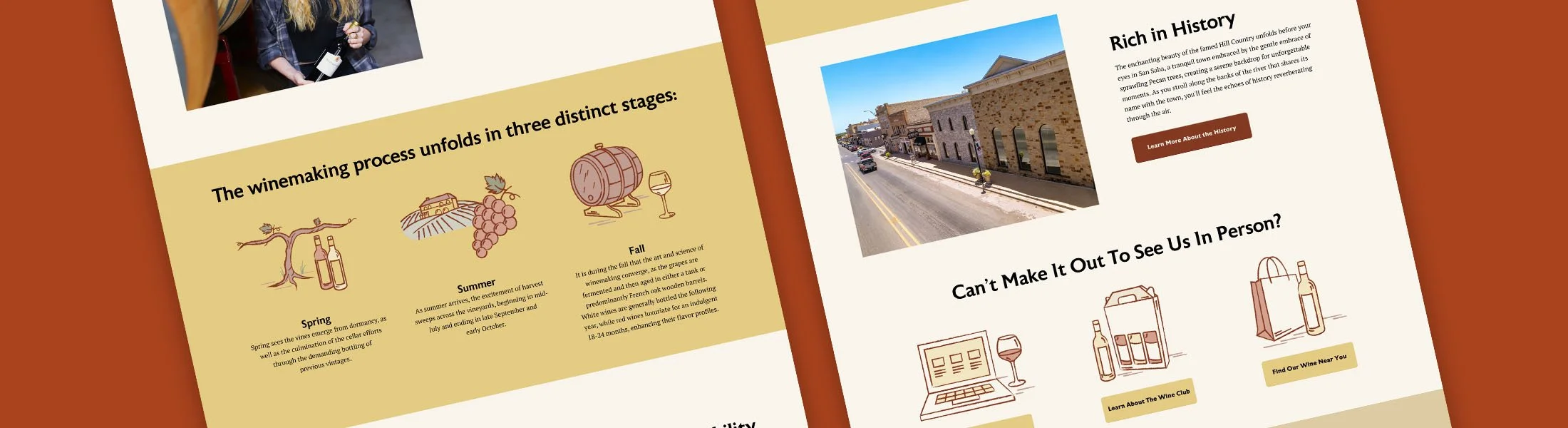 Wedding Oak Winery is one of the many great wineries that dot the Texas Hill Country. It's not enough to have fantastic wine (which, they in fact do) but to stand out among the 100+ other wineries in the area. Their goal was to represent the true heart of their brand—to honor the unique terroir in Texas that allows for great wine-growing conditions and to highlight their three distinct locations and the communities that they're a part of. Each of their wineries is housed in a historic building in charming small towns across central Texas. This became a big part of their new site design, featuring the textures and designs of the buildings themselves that hold so much history and personality. I added this as well as custom illustrated icons and new typography to transform their brand style and fill in the gaps they previously had in their brand guidelines.